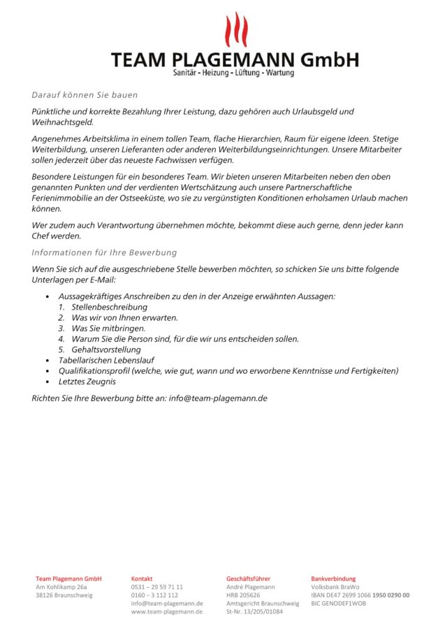 Richten Sie Ihre Bewerbung bitte an: info@team-plagemann.de